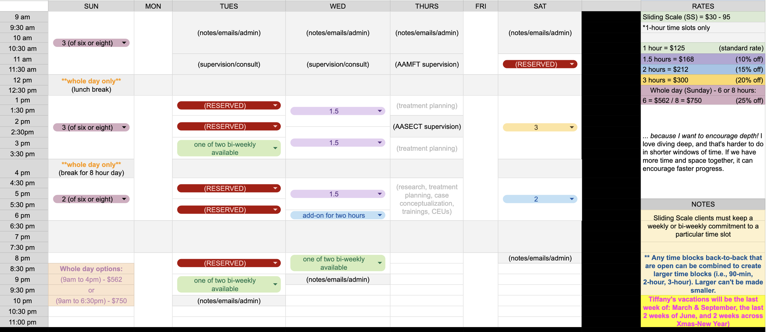 These longer sessions can be particularly useful for: polycules, couples in crisis, EMDR intensives for longer/faster processing, decision/discernment therapy around making a time-sensitive choice, families/groups, people with busy schedules who want to pack weeks or months of therapy time into one day, premarital counseling, and neurodivergent clients who enjoy focusing on one thing for longer amounts of time.